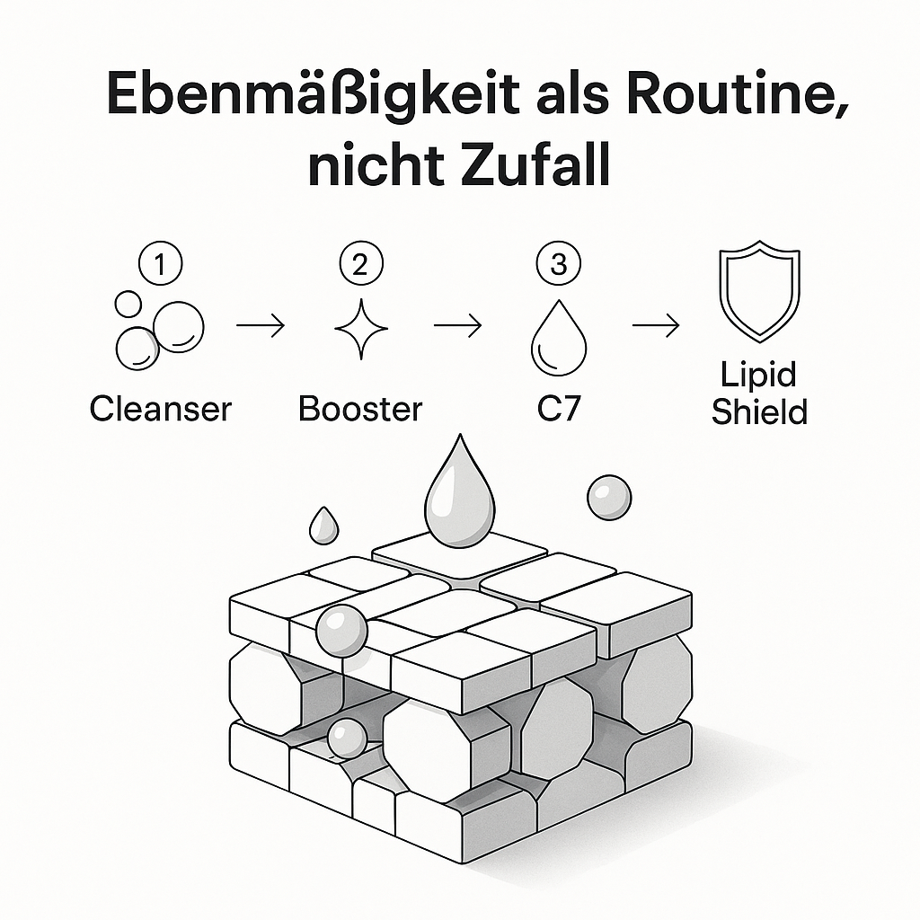 Für sichtbare Konstanz im Alltag, ohne Trial and Error. Hinweis, empfindliche Haut startet jeden zweiten Abend mit C7, tagsüber immer SPF.